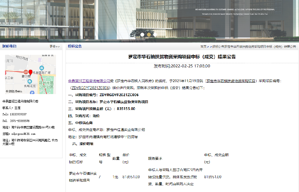 鼎點娛樂工程咨詢有限公司受《羅定市華石鎮(zhèn)人民政府》的委托,于2021年11月19日就(羅定市華石鎮(zhèn)扶貧物資采購項目)采購項目編號:(ZDYRGDYF2021ZC006)詢價進行采購,F(xiàn)就本次采購的中標(biāo)(成交)結(jié)果公告如下:一、采購項目編號:ZDYRGDYF2021ZC006二、采購項目名稱:羅定市華石鎮(zhèn)扶貧物資采購項目三、采購項目預(yù)算金額([詳細(xì)]